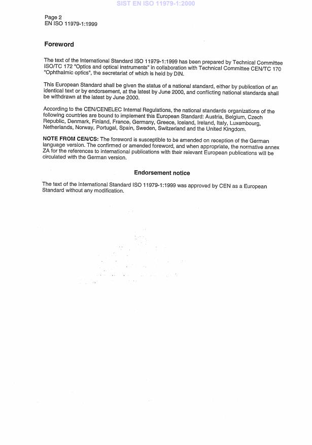 It always was and still is the intention of the Technical Committees ISO/TC 172/SC 7 and CEN/TC 170 to prepareidentical ISO and CEN (European Committee for Standardization) standards on intraocular lenses. However, during thepreparation of part 7 of this series, problems were encountered with normative references to the existing ISO 14155 andEN 540 horizontal standards on clinical investigation of medical devices, which are similar but not identical.ISO and CEN principles concerning normative references made it impossible to continue the preparation of identicalInternational and European Standards on the clinical investigation of intraocular lenses. As a result, two different standardsseries have had to be prepared. For this part of ISO 11979, identical versions exist for ISO and CEN (ISO 11979-1 andEN ISO 11979-1). For those parts where no identical versions exist, it is the intention of ISO/TC 172/SC 7 and CEN/TC 170 torevise these standards with the goal to end up with identical ones as soon as identical ISO and CEN horizontal standards onclinical investigations become available.SIST EN ISO 11979-1:2000