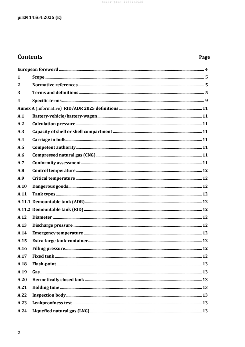prEN 14564 is a draft published by the European Committee for Standardization (CEN). Its full title is "Tanks for transport of dangerous goods - Terminology". This standard covers: This document provides additional terms and definitions to those written in the Agreement Concerning the International Carriage of Dangerous Goods by Road (ADR) or the Regulations concerning the International Carriage of Dangerous Goods by Rail (RID), appearing as Appendix C to the Convention concerning International Carriage by Rail (COTIF). This document forms part of series of documents prepared by CEN/TC 296 regarding the transport of dangerous goods. The series supports the proper application of the ADR and RID. This document is applicable to tanks used for the transport of dangerous goods. This document does not apply to carriage in bulk of dangerous goods. For convenience, Annex A (informative) repeats some horizontal definitions taken from ADR and RID 2025 chapter 1.2, and Annex B (informative) repeats some definitions from ADR and RID 2025 chapter 6.7, specific to portable tanks. NOTE The ADR and RID are updated on a regular basis, therefore Annexes A and B might become out of date. For outdated definitions, the RID/ADR take precedence. Annexes C, D and E (informative) provide alphabetical trilingual indexes of terms in English, French and German where the key is English, French and German respectively. Annex F (normative) is a schematic diagram of tank openings and closures according to the tank code.