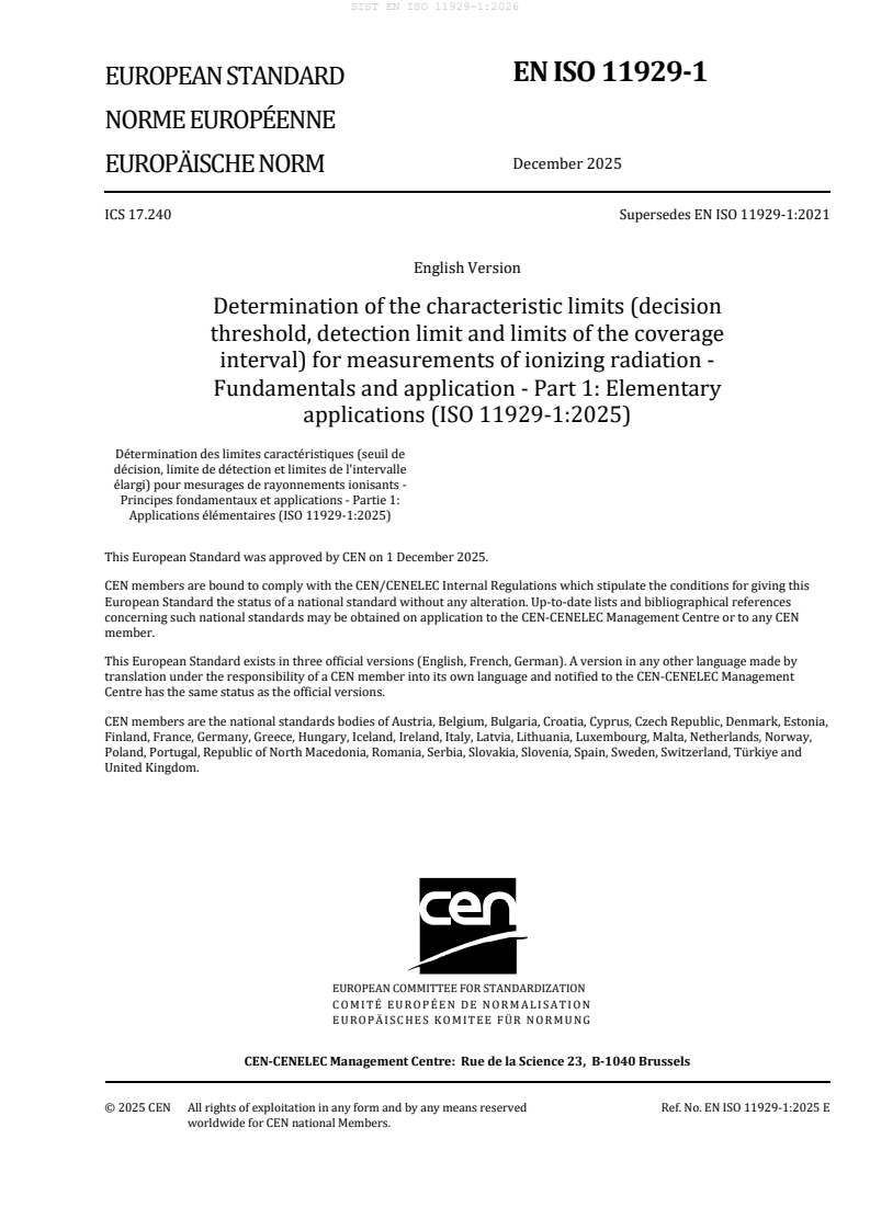 EN ISO 11929-1:2025 is a standard published by the European Committee for Standardization (CEN). Its full title is "Determination of the characteristic limits (decision threshold, detection limit and limits of the coverage interval) for measurements of ionizing radiation - Fundamentals and application - Part 1: Elementary applications (ISO 11929-1:2025)". This standard covers: The ISO 11929 series specifies a procedure, in the field of ionizing radiation metrology, for the calculation of the “decision threshold”, the “detection limit” and the “limits of the coverage interval” for a non-negative ionizing radiation measurand when counting measurements with preselection of time or counts are carried out. The measurand results from a gross count rate and a background count rate as well as from further quantities on the basis of a model of the evaluation. In particular, the measurand can be the net count rate as the difference of the gross count rate and the background count rate, or the net activity of a sample. It can also be influenced by calibration of the measuring system, by sample treatment and by other factors. ISO 11929 has been divided into four parts covering elementary applications in this document, advanced applications on the basis of the ISO/IEC Guide 3-1 in ISO 11929-2, applications to unfolding methods in ISO 11929-3, and guidance to the application in ISO 11929-4. This document covers basic applications of counting measurements frequently used in the field of ionizing radiation metrology. It is restricted to applications for which the uncertainties can be evaluated on the basis of the ISO/IEC Guide 98-3 (JCGM 2008). In Annex A, the special case of repeated counting measurements with random influences is covered, while measurements with linear analogous ratemeters are covered in Annex B. ISO 11929-2 extends the former ISO 11929:2010 to the evaluation of measurement uncertainties according to the ISO/IEC Guide 98-3:2008/Suppl 1:2008. ISO 11929-2 also presents some explanatory notes regarding general aspects of counting measurements and on Bayesian statistics in measurements. ISO 11929-3 deals with the evaluation of measurements using unfolding methods and counting spectrometric multi-channel measurements if evaluated by unfolding methods, in particular, for alpha- and gamma‑spectrometric measurements. Further, it provides some advice on how to deal with correlations and covariances. ISO 11929-4 gives guidance to the application of the ISO 11929 series, summarizes shortly the general procedure and then presents a wide range of numerical examples. Information on the statistical roots of ISO 11929 and on its current development may be found elsewhere[33][34]. The ISO 11929 series also applies analogously to other measurements of any kind especially if a similar model of the evaluation is involved. Further practical examples can be found, for example, in ISO 18589[1], ISO 9696[2], ISO 9697[3], ISO 9698[4], ISO 10703[5], ISO 7503[6], ISO 28218[7] and ISO 11665[8]. NOTE A code system, named UncertRadio, is available for calculations according to ISO 11929-1 to ISO 11929-3. UncertRadio[31][32] can be downloaded for free from https://www.thuenen.de/en/institutes/fisheries-ecology/fields-of-activity/marine-environment/coordination-centre-of-radioactivity/uncertradio. The download contains a setup installation file which copies all files and folders into a folder specified by the user. After installation one has to add information to the PATH of Windows as indicated by a pop‑up window during installation. English language can be chosen and extensive “help” information is available.