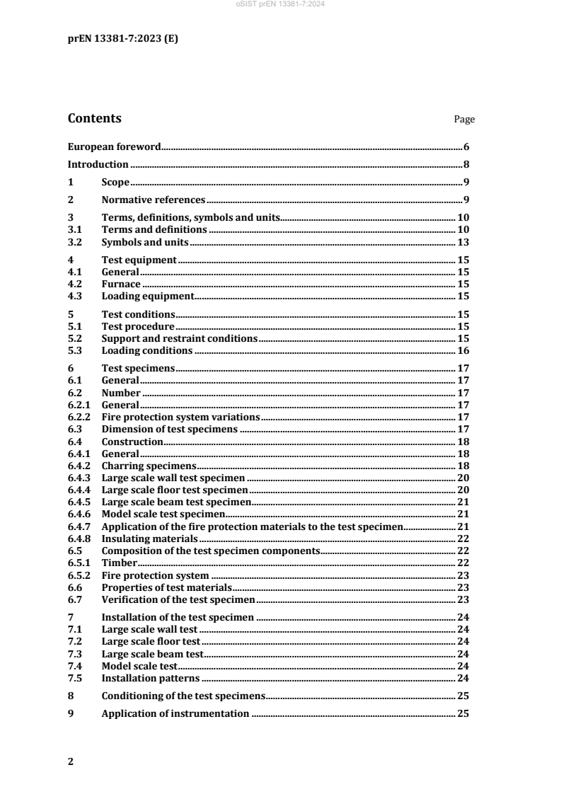 This document contains the fire test which specifies the test to be carried out to determine the ability of the fire protection kit at a specified thickness to delay the temperature rise throughout the timber member, to determine the ability of the fire protection kit at a specified thickness to remain coherent and fixed to the timber member and to provide data for determining the charring rate of the protected test member, when exposed to the standard temperature/time curve according to the procedures defined herein. This document is not appropriated to classify the tested assembly according to EN 13501 2.