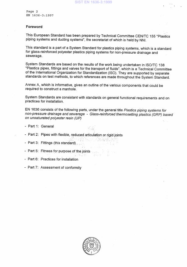 EN 1636-3:1997 is a standard published by the European Committee for Standardization (CEN). Its full title is "Plastics piping systems for non-pressure drainage and sewerage - Glass-reinforced thermosetting plastics (GRP) based on unsaturated polyester resin (UP) - Part 3: Fittings". This standard covers: This part of prEN 1636 specifies the characteristics of fittings made from glass-reinforced thermosetting plastics pipes or moulded based on unsaturated polyester resin (GRP-UP) intended to be used for non-pressure drainage and sewerage. It also specifies the test parameters for the test methods referred to in this standard. It is applicable to fittings intended to be used for the conveyance of surface water or sewage, below ground, outside buildings, at temperatures up to 50 oC.
