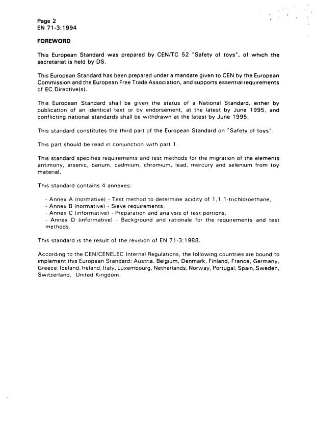 EN 71-3:1994 is associated with the following European legislation: EU Directives/Regulations: 88/378/EEC; Standardization Mandates: M/BC/CEN/91/2. When a standard is cited in the Official Journal of the European Union, products manufactured in conformity with it benefit from a presumption of conformity with the essential requirements of the corresponding EU directive or regulation.