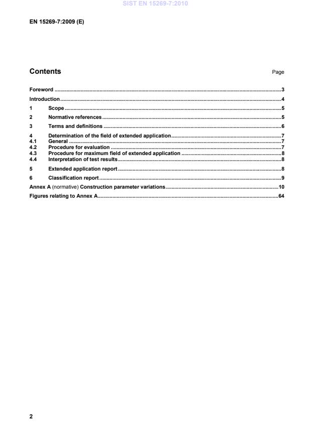 Ta evropski standard, ki se mora obravnavati v povezavi s prEN 15269-1, vključuje naslednje vrste vrat na osnovi jekla: vodoravna drsna vrata (enojna in dvojna), teleskopska vrata (enojna in dvojna) in enojna navpična drsna vrata. Ta dokument predpisuje metodologijo za razširitev uporabe rezultatov preskusa, pridobljenih s preskusi, opravljenimi v skladu z EN 1634-1. Razširjena uporaba lahko v skladu z opravljenim ustreznim preskusom ali preskusi, izbranimi med tistimi, opredeljenimi v Klavzuli 4, vključuje vse ali del navedenega v naslednjem neizčrpnem seznamu: razvrstitev le glede na integriteto (E), sevanje (EW) ali izolirana razvrstitev (EI1 ali EI2); vratno krilo; fiksni elementi na steni/stropu (ogrodje/sistem za obešanje); zasteklitev vratnih kril; izdelki gradbene strojne opreme; okrasni zaključki; intumescenčna, dimna, vetrovna ali akustična tesnila; alternativne podporne konstrukcije.