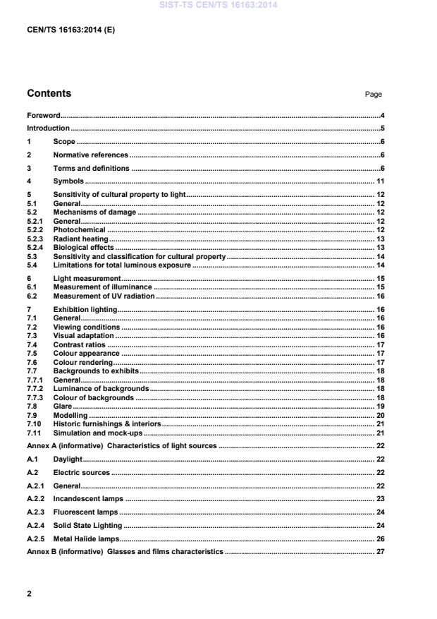 This Technical Specification defines the procedures as well as the means to implement adequate lighting, with regard to the conservation policy. It takes visual, exhibition and conservation aspects into account and it also discusses the implications of the lighting design on the safeguarding of cultural property. This Technical Specification gives recommendations on values of minimum and maximum illumination levels. It aims to provide a tool for setting up a common European policy and a guide to help curators, conservators and project managers to assess the correct lighting that can assure the safeguarding of the exhibits. This Technical Specification covers lighting for heritage objects on exhibition in both public and private sites and does not consider lighting in other cultural heritage contexts such as open-air collections, etc.