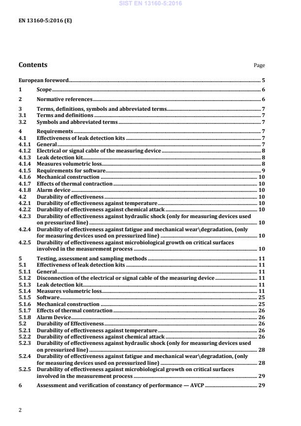 Contents Page European foreword . 5 1 Scope . 6 2 Normative references . 6 3 Terms, definitions, symbols and abbreviated terms . 7 3.1 Terms and definitions . 7 3.2 Symbols and abbreviated terms . 7 4 Requirements . 7 4.1 Effectiveness of leak detection kits . 7 4.1.1 General . 7 4.1.2 Electrical or signal cable of the measuring device . 8 4.1.3 Leak detection kit. 8 4.1.4 Measures volumetric loss . 8 4.1.5 Requirements for software . 9 4.1.6 Mechanical construction . 10 4.1.7 Effects of thermal contraction . 10 4.1.8 Alarm device . 10 4.2 Durability of effectiveness . 10 4.2.1 Durability of effectiveness against temperature . 10 4.2.2 Durability of effectiveness against chemical attack . 10 4.2.3 Durability of effectiveness against hydraulic shock (only for measuring devices used on pressurized line) . 10 4.2.4 Durability of effectiveness against fatigue and mechanical wear\degradation, (only for measuring devices used on pressurized line) . 10 4.2.5 Durability of effectiveness against microbiological growth on critical surfaces involved in the measurement process . 10 5 Testing, assessment and sampling methods . 11 5.1 Effectiveness of leak detection kits . 11 5.1.1 General . 11 5.1.2 Disconnection of the electrical or signal cable of the measuring device . 11 5.1.3 Leak detection kit. 11 5.1.4 Measures volumetric loss . 11 5.1.5 Software . 25 5.1.6 Mechanical construction . 25 5.1.7 Effects of thermal contraction . 26 5.1.8 Alarm Device . 26 5.2 Durability of Effectiveness . 26 5.2.1 Durability of effectiveness against temperature . 26 5.2.2 Durability of effectiveness against chemical attack . 26 5.2.3 Durability of effectiveness against hydraulic shock (only for measuring devices used on pressurized line) . 28 5.2.4 Durability of effectiveness against fatigue and mechanical wear\degradation, (only for measuring devices used on pressurized line) . 28 5.2.5 Durability of effectiveness against microbiological growth on critical surfaces involved in the measurement process . 29 6 Assessment and verification of constancy of performance — AVCP . 29 SIST EN 13160-5:2016