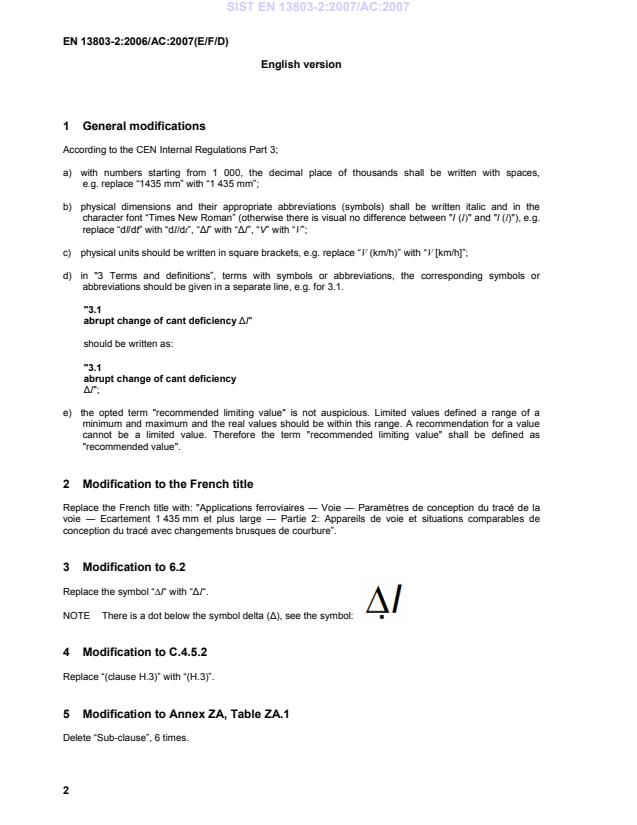 Partie 2: Appareils de voie et situations comparables de conception du tracé avec changements brusques de courbure”. 3 Modification to 6.2 Replace the symbol “∆I“ with “ûI“. NOTE There is a dot below the symbol delta (û), see the symbol: 4 Modification to C.4.5.2 Replace “(clause H.3)” with “(H.3)”. 5 Modification to Annex ZA, Table ZA.1 Delete “Sub-clause”, 6 times. SIST EN 13803-2:2007/AC:2007