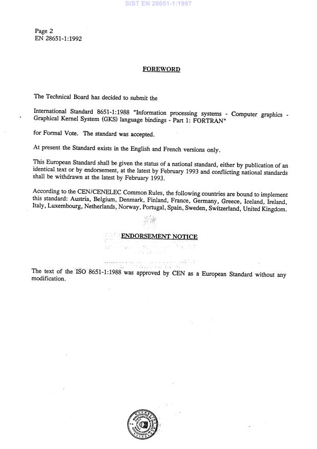 EN 28651-1:1992 is a standard published by the European Committee for Standardization (CEN). Its full title is "Information processing systems - Computer graphics - Graphical Kernel System (GKS) language bindings - Part 1: FORTRAN (ISO 8651-1:1988)". This standard covers: Information processing systems - Computer graphics - Graphical Kernel System (GKS) language bindings - Part 1: FORTRAN (ISO 8651-1:1988)