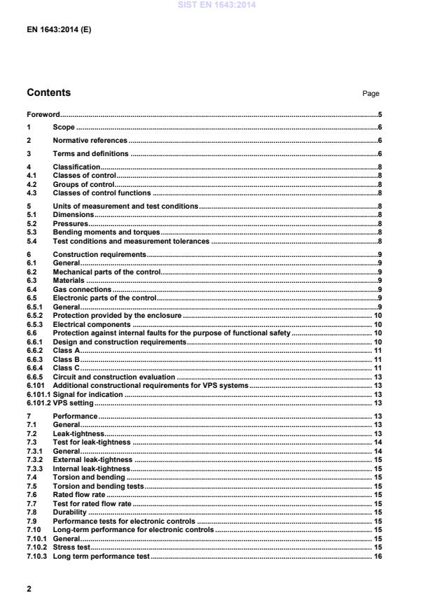 3, mutually perpendicular 7.10.3 Long term performance test Shall be according to EN 13611:2007+A2:2011, 7.10.3. 7.101 Functional requirements 7.101.1 General The VPS shall allow the opening of the valves to the burner and subsequent ignition below the detection limit. The VPS shall prevent the opening of the valve and operation of the ignition system when the detection limit is exceeded. Interruption of the mains supply and its restoration shall not affect the safety of the programme sequence. If mains interruption and its restoration result in automatic recycling and overriding of any interlock, the VPS shall restart from the beginning of the programme sequence. 7.101.2 Programme sequence The programme sequence for the VPS shall enable ignition and opening of the valves to operate the burner below the detection limit, and shall prevent ignition and opening of the valves when the detection limit is exceeded, in accordance with 7.101.5, followed by a lock-out. The lock-out may be executed on the system application direct or by the VPS itself. An automatic start-up attempt by a control function shall not override the lock-out conditions. Any gas necessary for the operation of the VPS may be discharged into the combustion chamber during the programme sequence if the maximum release volume, expressed in litres per switching sequence, does not exceed 0,083 % of the burner heat input referred to the nominal volume flow, expressed in cubic metres per hour. NOTE 0,083 % is based on the quantity within 3 s. However, when the VPS is used as an alternative for pre-purge or post-purge, discharge of the gas necessary for the operation of the VPS into the combustion chamber might not be allowed; the gas shall be vented into the atmosphere at a safe location. If the actuating energy in the safety circuit fails, the VPS shall close the main gas valves and any ignition gas valve or give a shut-down signal to the automatic gas-burner control system. 7.101.3 Timing The leakage testing time and the pressure pump time (if applicable) shall be specified in the installation and operating instructions. Adjustment of safety critical timing is permitted but shall be possible only by means of tools. Where these times can be adjusted using an existing scale on the component, the scale shall be accurate to ± 10 % of the indicated value. The means of adjustment shall be readily identifiable (e.g. colour-coded). SIST EN 1643:2014