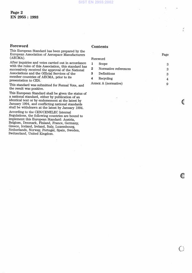 EN 2955:1993 is a standard published by the European Committee for Standardization (CEN). Its full title is "Aerospace series - Recycling of titanium and titanium alloy scrap". This standard covers: This standard defines the general requirements for recycling titanium and titanium alloy scrap used for the production of ingots.