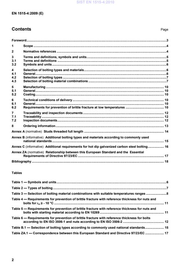 Essential Requirements of Directive 97/23/EC . 17Bibliography . 18 Tables Table 1 — Symbols and units .6Table 2 — Types of bolting .7Table 3 — Selection of bolting material combinations with suitable temperatures ranges .8Table 4 — Requirements for prevention of brittle fracture with reference thickness for nuts and bolts for tM ≥≥≥≥ - 10 °C . 11Table 5 — Requirements for prevention of brittle fracture with reference thickness for nuts and bolts with starting material according to EN 10269 . 11Table 6 — Requirements for prevention of brittle fracture with reference thickness for bolts according to EN ISO 3506-1 and nuts according to EN ISO 3506-2 . 12Table B.1 — Selection of bolting types according to commonly used national standards . 15Table ZA.1 — Correspondence between this European Standard and Directive 97/23/EC . 17 SIST EN 1515-4:2010