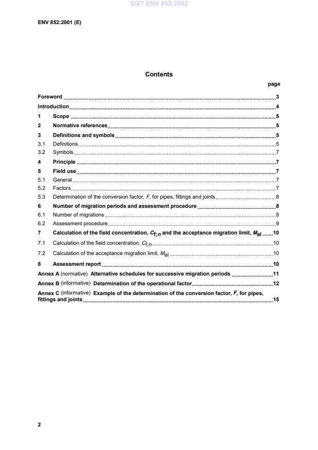 ENV 852:2001 is a standardization document published by the European Committee for Standardization (CEN). Its full title is "Plastics piping systems for the transport of water intended for human consumption - Migration assessment - Guidance on the interpretation of laboratory derived migration values". This standard covers: This Prestandard is applicable to plastics pipes, joints and fittings to be used for the transport of water intended for human consumption and raw water used for the manufacture of water intended for human consumption. It gives guidance on: 1) number of successive migration periods to be carried out; 2) how to interpret M values calculated from successive migration periods; 3) a method for converting M values into values that reflect field use conditions; 4) acceptance criteria for the duplicate M values obtained by testing in accordance with EN ISO 8795.