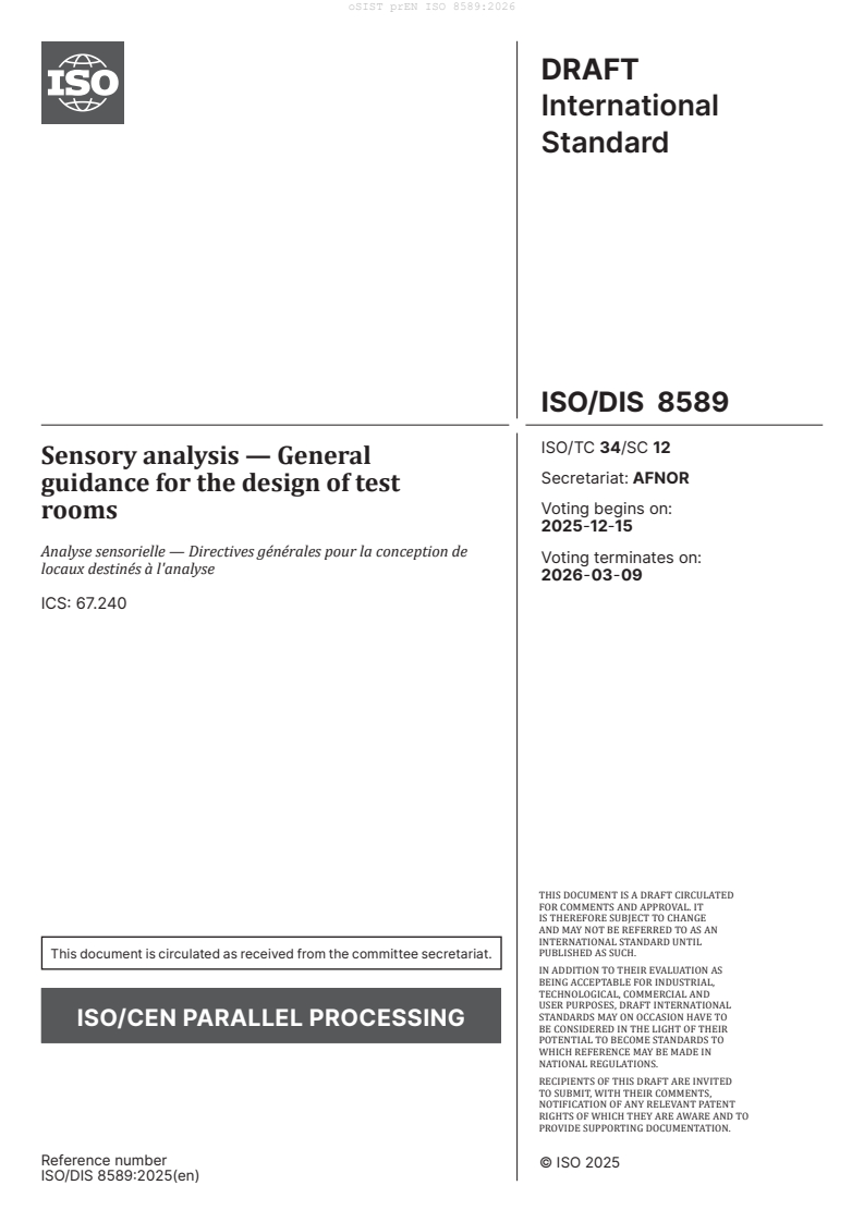 prEN ISO 8589 is a draft published by the European Committee for Standardization (CEN). Its full title is "Sensory analysis - General guidance for the design of test rooms (ISO/DIS 8589:2025)". This standard covers: ISO 8589 provides general guidance for the design of test rooms intended for the sensory analysis of products. It describes the requirements to set up a test room comprising a testing area, a preparation area, and an office, specifying those that are essential or those that are merely desirable. ISO 8589 is not specific for any product or test type. Although many of the general principles are similar, ISO 8589 does not address test facilities for the specialized examination of products in inspection or in-plant quality-control applications.