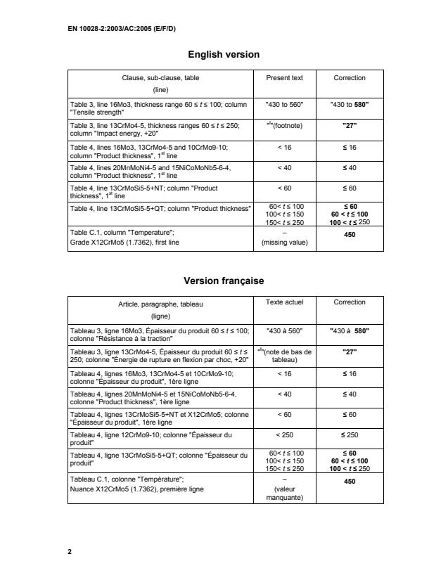 B-1050 Brussels© 2005 CENAll rights of exploitation in any form and by any means reserved worldwide for CEN national Members.Tous droits d'exploitation sous quelque forme et de quelque manière que ce soit réservés dans le monde entier auxmembres nationaux du CEN.Alle Rechte der Verwertung, gleich in welcher Form und in welchem Verfahren, sind weltweit den nationalen Mitgliedernvon CEN vorbehalten.Ref. No.:EN 10028-2:2003/AC:2005 D/E/F