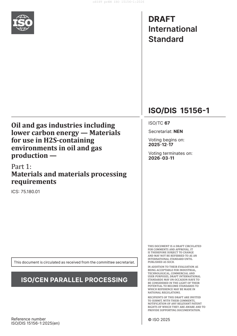 Oil and gas industries including lower carbon energy - Materials for use in H2S-containing environments in oil and gas production - Part 1: Materials and materials processing requirements (ISO/DIS 15156-1:2025)
