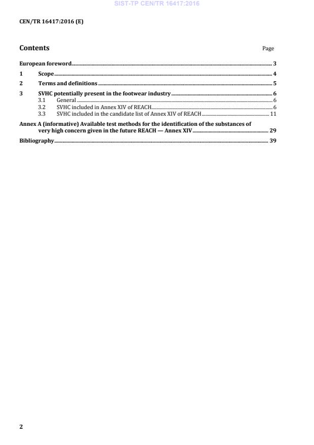 This Technical Report is intended to provide information on the chemicals listed in the Candidate List / Annex XIV of the Regulation (EC) 1907/2006, also known as REACH (Regulation, Evaluation and Authorisation of Chemicals) and their usage and presence in the footwear industry. The Annex XIV, overseen by the ECHA (European Chemicals Agency), is a list of substances subject to authorization, substances of very high concern (SVHC). Before the inclusion of a substance in the Annex XIV, the procedure is strictly fixed: - A European member state shall propose it to ECHA. - ECHA inform all the members’ state and a first enquiry is done in order to include the substance to the candidate list of Annex XIV. - After the agreement of the member’s state, ECHA includes the substances in the candidate list to Annex XIV. As soon as a substance has been included in the candidate list, it should be taken into account exactly as a SVHC. - ECHA prioritises the substances from the Candidate List to determine which ones should be included in the Authorisation List (Annex XIV of REACH) and therefore, subject to authorisation. ECHA regularly submits recommendations to the European Commission, who will decide on the substances to be included in the Authorisation List. Following the evaluation of the Annex XIV substances, ECHA can take the decision to restrict the substances. This restriction may take the form of an authorization for use, an authorisation only for specific applications in specified fields or, in some cases, a complete ban on the use of the substance. During the evaluation process, these chemicals are not forbidden or limited in use. The regulation requires that the user shall be informed if one or more of these substances are present in any part of the article in quantity over 0,1 % by weight. This Technical Report shows which of these chemicals may be present in footwear materials and the footwear industry in order to help shoe manufacturers to collect mandatory information from suppliers regarding the content of these chemicals and, at same time, allow them to provide accurate information to their customers. The test methods reported in Annex 1 are informative only to identify where these chemicals may be found and control the use along the supply chain where their suppliers are not under the jurisdiction of the REACH Regulation. Taking into account final decision of the European Commission, ECHA, implements the Annex XIV and the candidate list to Annex XIV of REACH, regularly. This revision interval is difficult to follow by the standardization procedures. Therefore this document reflects the situation at the date of June 2014. This document will be annually revised. This Technical Report does not concern the substances for which restriction have been already enacted under Annex XVII of REACH. NOTE Chemicals that are restricted under Annex XVII, are identified as a category 1 chemical in CEN ISO/TR 16178.