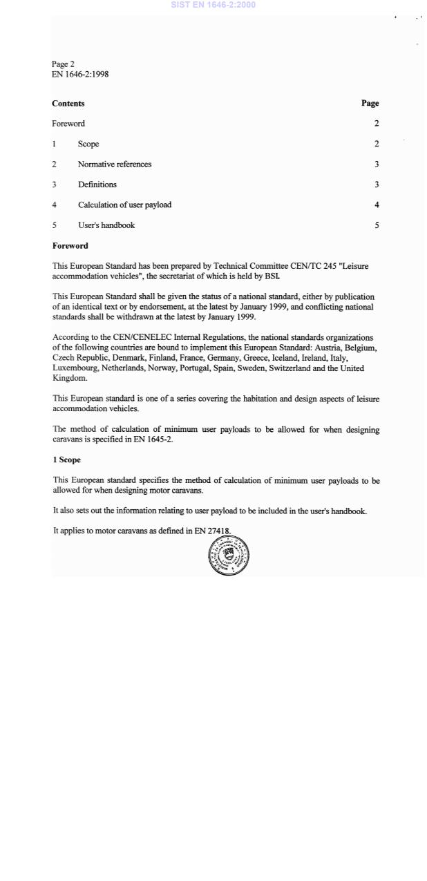 EN 1646-2:1998 is a standard published by the European Committee for Standardization (CEN). Its full title is "Leisure accommodation vehicles - Motor caravans - Part 2: User payload". This standard covers: This European standard specifies the method of calculation of minimum user payloads to be allowed for when designing motor caravans. It also sets out the information relating to user payload to be included in the user's handbook. It applies to motor caravans as defined in EN 27418.