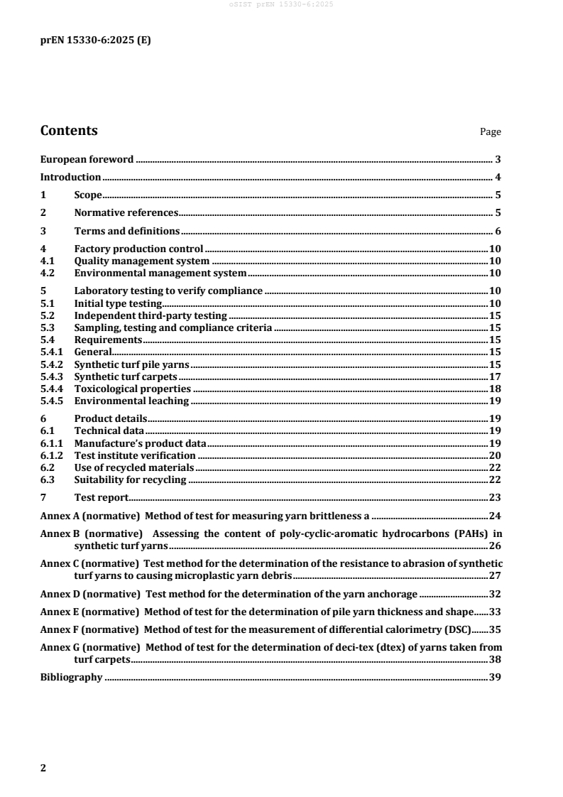 Keywords: synthetic turf carpets, sports surfaces, synthetic grass, durability standards, environmental safety, toxicological requirements, synthetic turf testing, sustainable sports turf, sports facility surfacing, recycled synthetic turf, microplastic pollution prevention, CEN standard prEN 15330-6.