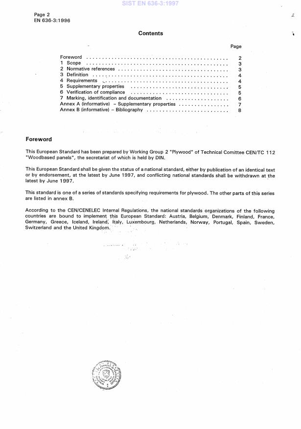EN 636-3:1996 is a standard published by the European Committee for Standardization (CEN). Its full title is "Plywood - Specifications - Part 3: Requirements for plywood for use in exterior conditions". This standard covers: This European Standard specifies basic requirements for plywood for use in exterior conditions. Additional information on supplementary properties for cer-tain applications is also given.