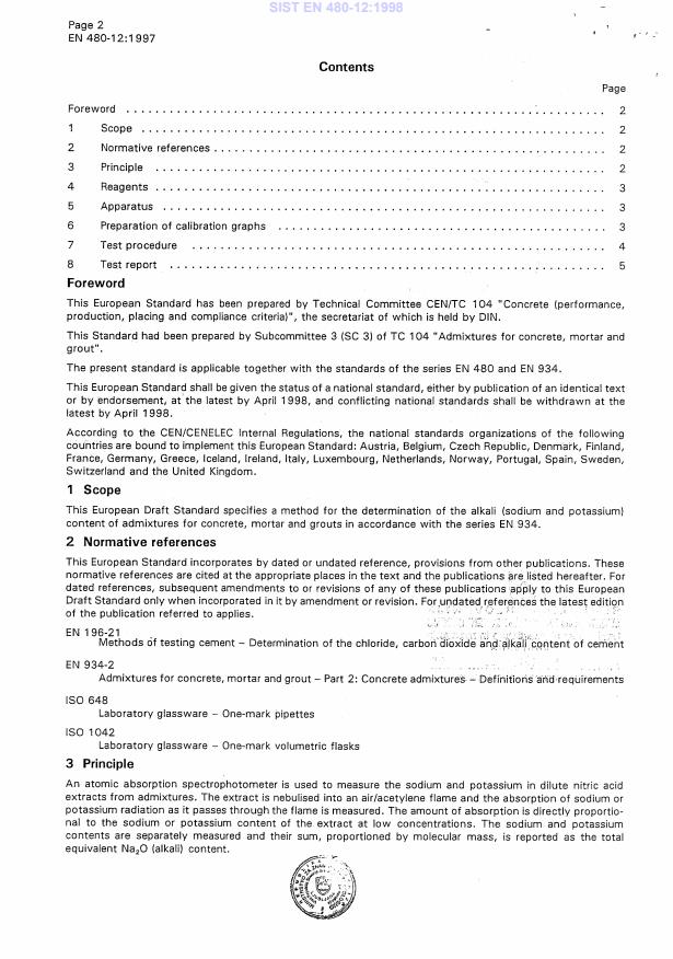 EN 480-12:1997 is a standard published by the European Committee for Standardization (CEN). Its full title is "Admixtures for concrete, mortar and grout - Test methods - Part 12: Determination of the alkali content of admixtures". This standard covers: This European Draft Standard specifies a method for the determination of the alkali (sodium and potassium) content of admixtures for concrete, mortar and grouts in accordance with the series EN 934.