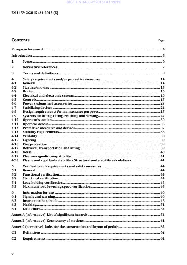 February 2018. This document supersedes EN 1459-2:2015. The start and finish of text introduced or altered by amendment is indicated in the text by tags !". This document has been prepared under a mandate given to CEN by the European Commission and the European Free Trade Association, and supports essential requirements of EU Directive(s). For relationship with EU Directive(s), see informative Annex ZA, which is an integral part of this document. EN 1459, Rough-terrain trucks — Safety requirements and verification, consists of the following parts: — Part 1: Variable-reach trucks — Part 2: Slewing variable-reach trucks — Part 3: Interface between the variable-reach truck and the work platform — Part 4: Additional requirements for variable reach trucks handling suspended loads — Part 5: Additional requirements for attachments and attachment interface — Part 6: Risk assessment methodology and control system performance level determination (CEN/TR) — Part 7: Test method and determination of noise emission (in development) According to the CEN-CENELEC Internal Regulations, the national standards organizations of the following countries are bound to implement this European Standard: Austria, Belgium, Bulgaria, Croatia, Cyprus, Czech Republic, Denmark, Estonia, Finland, Former Yugoslav Republic of Macedonia, France, Germany, Greece, Hungary, Iceland, Ireland, Italy, Latvia, Lithuania, Luxembourg, Malta, Netherlands, Norway, Poland, Portugal, Romania, Serbia, Slovakia, Slovenia, Spain, Sweden, Switzerland, Turkey and the United Kingdom. SIST EN 1459-2:2015+A1:2019
