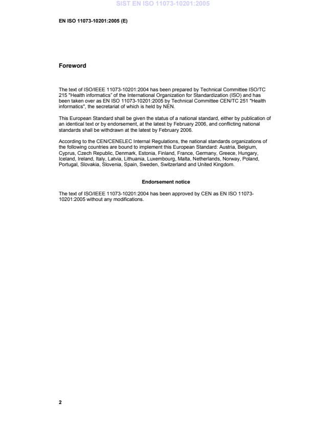 EN ISO 11073-10201:2005 is a standard published by the European Committee for Standardization (CEN). Its full title is "Health informatics - Point-of-care medical device communication - Part 10201: Domain information model (ISO/IEEE 11073-10201:2004)". This standard covers: ISO 11073-10201:2004 addresses the definition and structuring of information that is communicated or referred to in communication between application entities. ISO 11073-10201:2004 provides a common representation of all application entities present in the application processes within the various devices independent of the syntax. The definition of association control and lower layer communication is outside the scope of this International Standard.