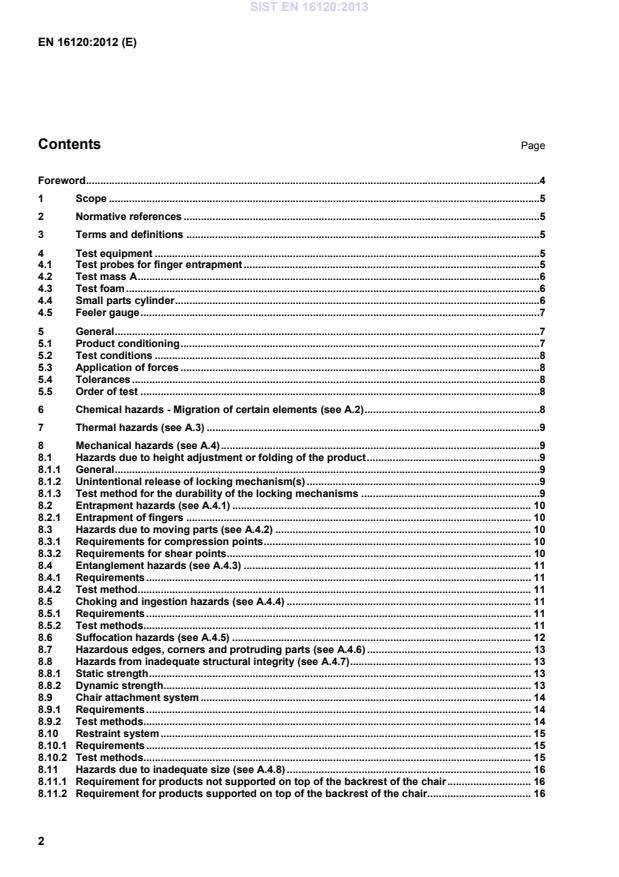 Rationales . 22A.1 Introduction . 22A.2 Chemical hazards (see Clause 6) . 22A.3 Thermal hazards (see Clause 7) . 22A.4 Mechanical hazards (see Clause 8) . 22A.4.1 Entrapment hazards (see 8.2) . 22A.4.2 Hazards due to moving parts (see 8.3) . 22A.4.3 Entanglement hazards (see 8.4) . 23A.4.4 Choking and ingestion hazards (see 8.5) . 23A.4.5 Suffocation hazards (see 8.6) . 23A.4.6 Hazardous edges, corners and protruding parts (see 8.7) . 23A.4.7 Hazards from inadequate structural integrity (see 8.8) . 23A.4.8 Hazards due to inadequate size (see 8.11) . 23 SIST EN 16120:2013