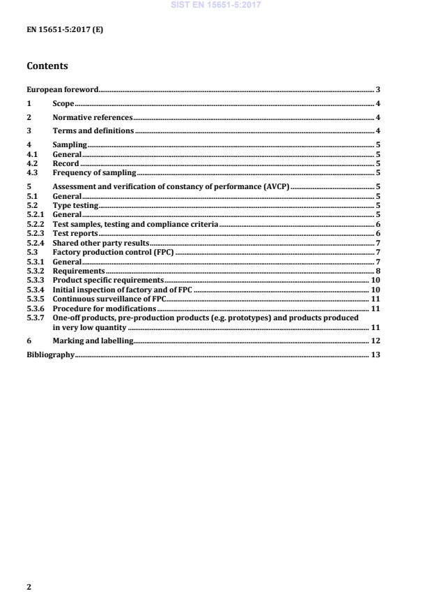Same AVCP system means testing by an independent third party, under the responsibility of a notified product certification body. For the purposes of assessment, the manufacturer's products may be grouped into families, where it is considered that the results for one or more characteristics from any one product within the family are representative for that same characteristics for all products within that same family. NOTE 2 Products may be grouped in different families for different characteristics. Reference to the assessment method standards should be made to allow the selection of a suitable representative sample. In addition, the determination of the product type shall be performed for all characteristics included in the standard for which the manufacturer declares the performance: — at the beginning of the production of a new or modified sealant for non-structural use in joints in buildings and pedestrian walkways (unless a member of the same product range), or — at the beginning of a new or modified method of production (where this may affect the stated properties); or they shall be repeated for the appropriate characteristic(s), whenever a change occurs in the sealants for non-structural use in joints in buildings and pedestrian walkways design, in the raw material or in the supplier of the components, or in the method of production (subject to the definition of a family), which would affect significantly one or more of the characteristics. Where components are used whose characteristics have already been determined, by the component manufacturer, on the basis of assessment methods of other product standards, these characteristics need not be re-assessed. The specifications of these components shall be documented. Products bearing regulatory marking in accordance with appropriate harmonized European specifications may be presumed to have the performances declared in the DoP, although this does not replace the responsibility on the sealants for non-structural use in joints in buildings and pedestrian walkways manufacturer to ensure that the sealants for non-structural use in joints in buildings and pedestrian walkways as a whole is correctly manufactured and its component products have the declared performance values. 5.2.2 Test samples, testing and compliance criteria The number of samples of sealants for non-structural use in joints in buildings and pedestrian walkways to be tested/assessed shall be in accordance with the product standards. 5.2.3 Test reports The results of the determination of the product type shall be documented in test reports. All test reports shall be retained by the manufacturer for at least 10 years after the last date of production of the sealants for non-structural use in joints in buildings and pedestrian walkways to which they relate. SIST EN 15651-5:2017