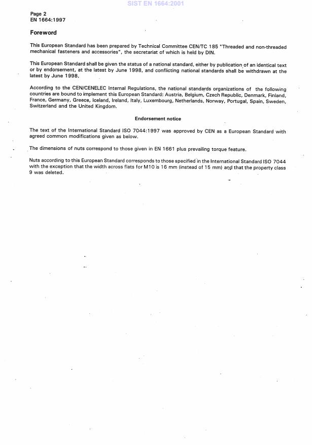 EN 1664:1997 is a standard published by the European Committee for Standardization (CEN). Its full title is "Prevailing torque type all-metal hexagon nuts with flange (ISO 7044:1997, modified)". This standard covers: This European Standard specifies the characteristics of prevailing torque type all-metal hexagon nuts with flange and threads from M5 to M20 inclusive, in product grade A for threads up to and including M16 and product grade B for threads above M16 and property classes 8, 10 and 12.