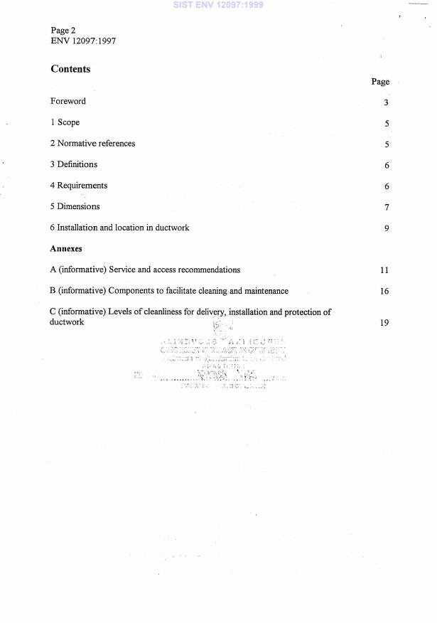 ENV 12097:1997 is a standardization document published by the European Committee for Standardization (CEN). Its full title is "Ventilation for buildings - Ductwork - Requirements for ductwork components to facilitate maintenance of ductwork systems". This standard covers: This prestandard applies to ductwork in buildings for human occupancy. It specifies the dimensions, shape and location requirements for openings, access and inspection covers and access doors for cleaning and service in ductwork. It applies to ductwork which is in accordance to standards prEN 1505, prEN 1506 and prEN XXXD.