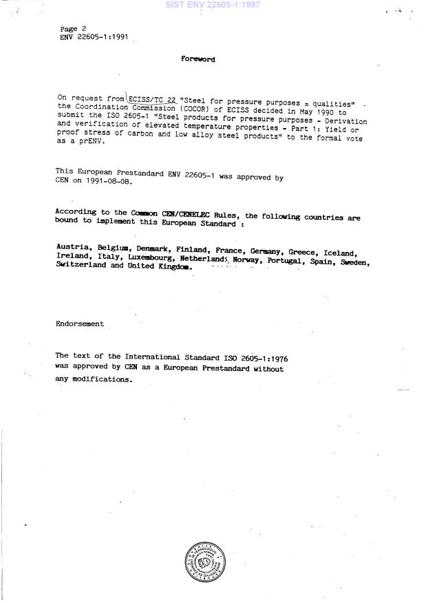 ENV 22605-1:1991 is a standard published by the European Committee for Standardization (CEN). Its full title is "Steel products for pressure purposes - Derivation and verification of elevated temperature properties - Part 1: Yield or proof stress of carbon and low alloy steel products (ISO 2605-1:1976)". This standard covers: This International Standard defines - a method for deriving minimum elevated temperature lower yield or proof stress values for inclusion in International Standards for steel products for pressure purposes;1 - a verification procedure which may be used by a manufacturer as an alternative to hot-testing for satisfying the purchaser that his product consistently meets the specified minimum elevated temperature proof stress values in such specifications. 1) Application to national standards