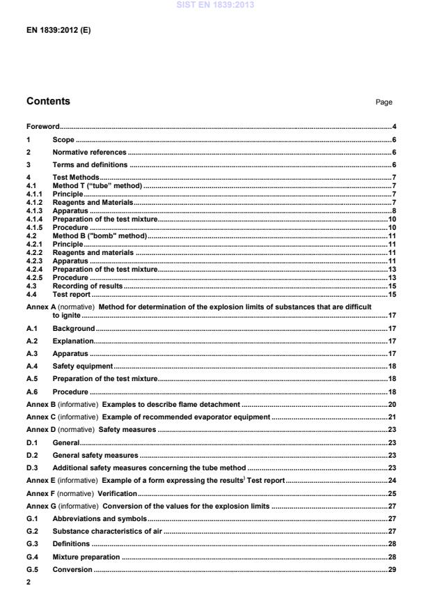 Diese Europäische Norm legt zwei Prüfverfahren (Verfahren T und Verfahren B) zum Bestimmen der Explosions¬grenzen von Gasen, Dämpfen und deren Gemischen in Mischung mit Luft fest. An Stelle von Luft kann als Oxidator auch ein Luft/Inertgas-Gemisch (Volumenanteil des Sauerstoffs 21 %) verwendet werden. In dieser Norm subsumiert der Ausdruck „Luft“ auch derartige Luft/Inertgas-Gemische.