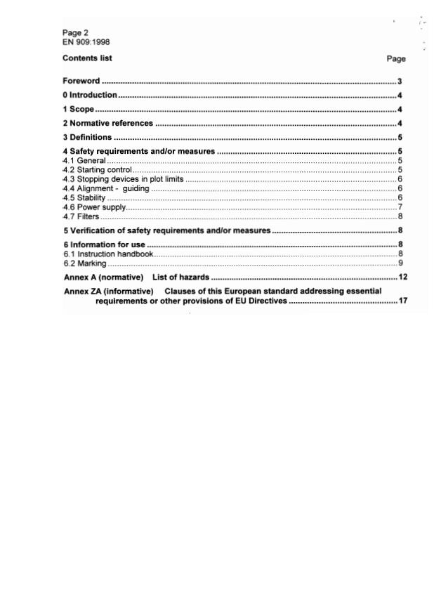 EN 909:1998 is associated with the following European legislation: EU Directives/Regulations: 98/37/EC; Standardization Mandates: M/BC/CEN/91/1. When a standard is cited in the Official Journal of the European Union, products manufactured in conformity with it benefit from a presumption of conformity with the essential requirements of the corresponding EU directive or regulation.