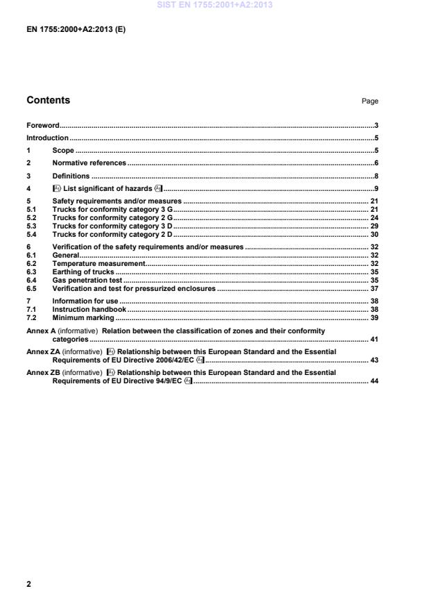 !EN 1459, Safety of industrial trucks — Self propelled variable reach trucks EN 1551, Safety of industrial trucks — Self propelled trucks over 10 000 kg capacity EN 1726-1, Safety of industrial trucks — Self propelled trucks up to and including 10 000 kg capacity and tractors with a drawbar pull including 20 000 N — Part 1: General requirements EN 1726-2, Safety of industrial trucks — Self propelled trucks up to and including 10 000 kg capacity and tractors with a drawbar pull including 20 000 N — Part 2: Additional requirements for trucks with elevating operator position and trucks specifically designed to travel with elevated load EN 1757-1, Safety of industrial trucks — Pedestrian propelled trucks — Part 1: Stacker trucks EN 1757-2, Safety of industrial trucks — Pedestrian propelled trucks — Part 2: Pallet trucks EN 1757-3, Safety of industrial trucks — Pedestrian controlled manual and semi-manual trucks — Part 3: Platform trucks EN 1757-4, Safety of industrial trucks — Pedestrian controlled manual and semi-manual trucks — Part 4: Scissor lift pallet-trucks" !and gives additional requirements for industrial trucks of equipment group II and equipment category 2G respectively 3G, 2D and 3D including their load handling devices as defined in Annex A." !deleted text" !This European Standard covers the technical requirements necessary to avoid or minimize the significant hazards listed in Clause 4 which could occur during normal operation, maintenance or foreseeable misuse (in accordance with the data given by the manufacturer or his authorised representative) of industrial trucks." SIST EN 1755:2001+A2:2013