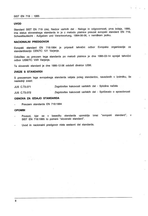 EN 719:1994 is a standard + national annex and/or foreword published by the European Committee for Standardization (CEN). Its full title is "Welding coordination - Tasks and responsibilities". This standard covers: This standard identifies the quality related responsibilities and tasks included in the coordination of welding related activities. In any manufacturing organization welding coordination may be undertaken by one or a number of persons. Welding coordination requirements can be specified by a manufacturer, contract or an application standard.