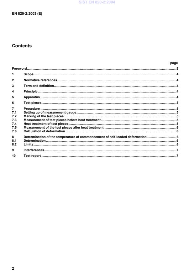 EN 820-2:2003 is a standard published by the European Committee for Standardization (CEN). Its full title is "Advanced technical ceramics - Methods of testing monolithic ceramics - Thermo-mechanical properties - Part 2: Determination of self-loaded deformation". This standard covers: This European Standard specifies a method for the determination of the temperature at which the self-loaded deformation of a ceramic test piece commences and the extent of this deformation.