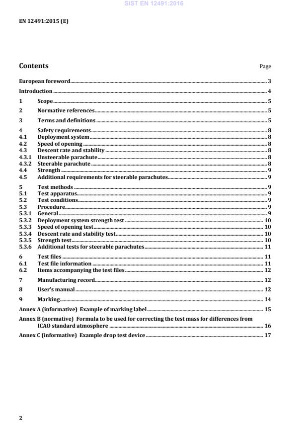 Key 1 suspension lines 2 risers Figure 2 — Example of steerable emergency parachute components 3.5 outer container external container, either supplied as part of the harness, or by the parachute manufacturer for attachment to a harness 3.6 inner container or deployment bag container of the folded emergency parachute 3.7 deployment system inner container and either the handle attachment point(s) or handle assembly 3.8 emergency parachute system emergency parachute combined with its deployment system SIST EN 12491:2016