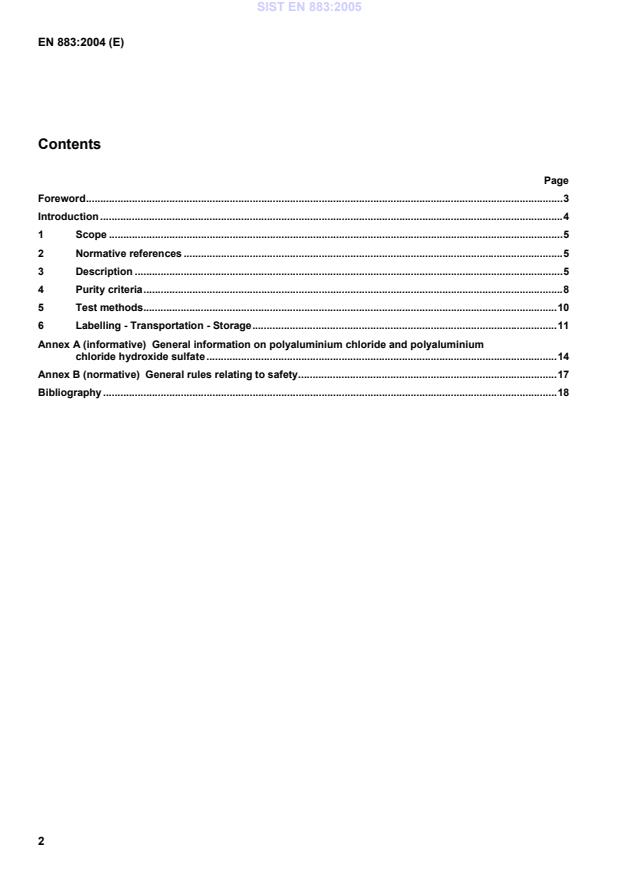 This document specifies the minimum purity requirements for polyaluminium chloride hydroxide and polyaluminium chloride hydroxide sulfate used for the treatment of water intended for human consumption. Limits are given for impurities commonly present in the product. Depending on the raw material and the manufacturing process other impurities may be present and, if so, this shall be notified to the user and when necessary to relevant authorities. NOTE Users of these products should check the national regulations in order to clarify whether it is of appropriate purity for treatment of water intended for human consumption, taking into account raw water quality, required dosage, contents of other impurities and additives used in the products not stated in this document. Limits have been given for impurities and chemical parameters where these are likely to be present in significant quantities from the current production process and raw materials. If the production process or raw materials lead to significant quantities of impurities, by-products or additives being present, this shall be notified to the user. 4.2 Composition of commercial product The concentration of active matter (aluminium ion content) in the commercial product expressed as grams per kilogram of product shall be within ± 3 % of the manufacturer's declared values. NOTE The concentration of water- soluble aluminium in commercial products varies. Typical values of aluminium content in the products can be between 42 g/kg and 124 g/kg. The commercial products vary in the proportions of chloride and sulfate ions. The relative basicity of the polyaluminium chloride hydroxide and polyaluminium chloride hydroxide sulfate, expressed as the mole ratio OH/3Al, shall be greater than 0,35. SIST EN 883: