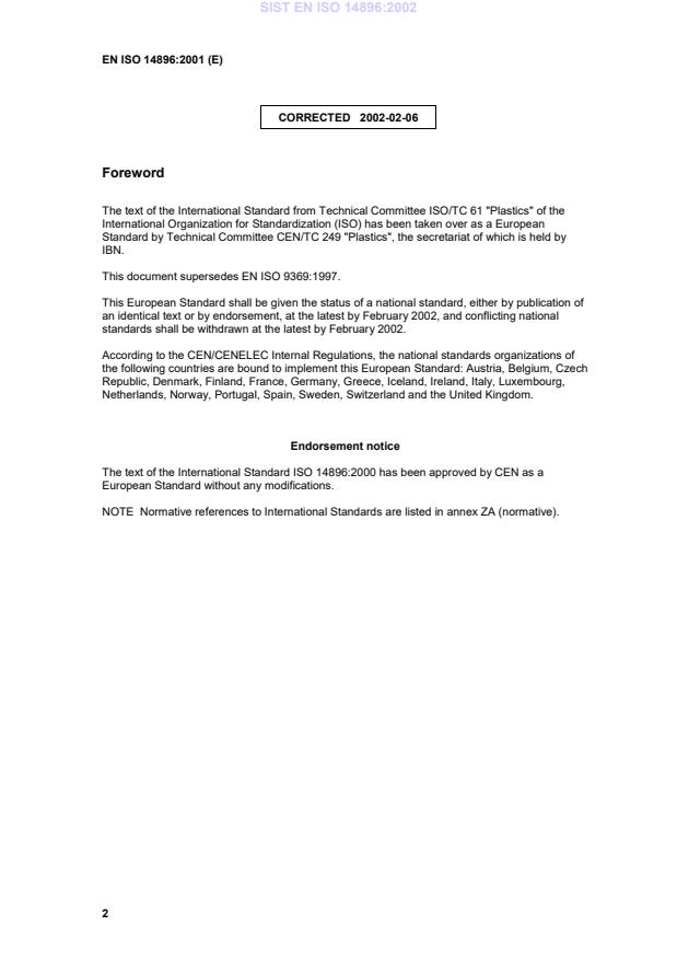 International Standard ISO 14896 was prepared by Technical Committee ISO/TC 61, Plastics, Subcommittee SC 12,