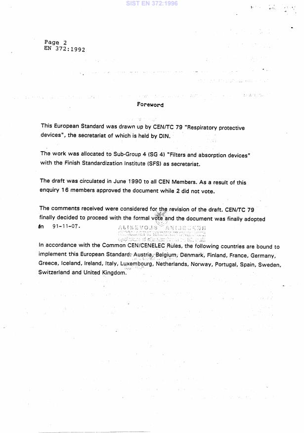 EN 372:1992 is a standard published by the European Committee for Standardization (CEN). Its full title is "Respiratory protective devices - SX gas filters and combined filters against specific named compounds - Requirements, testing, marking". This standard covers: This European Standard refers to gas filters and combined filters against specific named compounds for unassisted respiratory protective devices, except escape apparatus and filtering facepieces. It specifies minimum requirements for these filters for use as part of respiratory protective devices. Filters for use against nitrogen oxides, mercury and carbon monoxide are excluded from this standard. Laboratory and practical performance tests are included for the assessment of compliance with the requirements.
