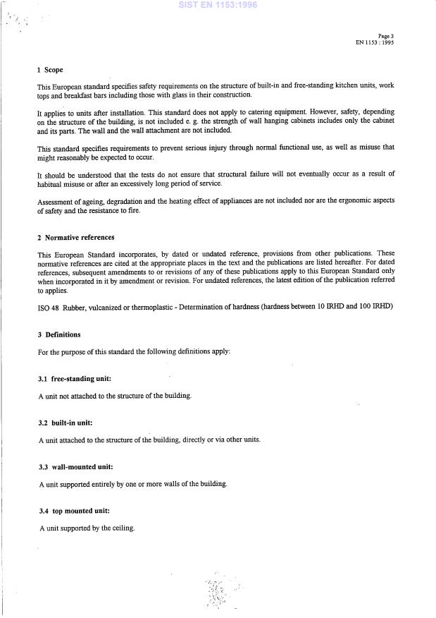 This European standard specifies safety requirements on the structure of built-in and free-standing kitchen units, work tops and breakfast bars including those with glass in their construction. It applies to units after installation. This standard does not apply to catering equipments. However, safety, depending on the structure of the building, is not included e.g. the strength of wall hangings cabinets includes only the cabinet and its parts. The wall and the fixing in the wall is not included.