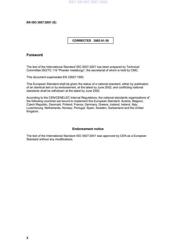 The text of the International Standard ISO 3927:2001 was approved by CEN as a European