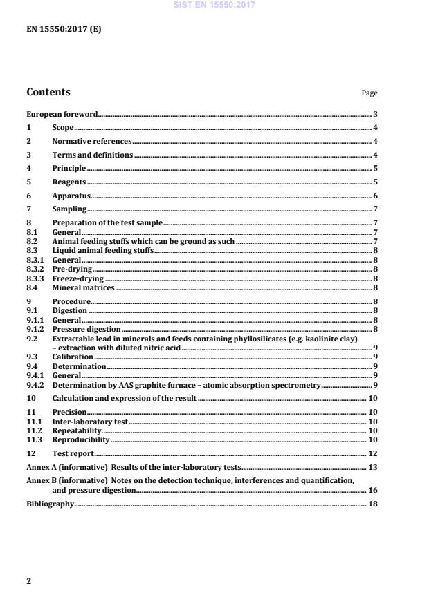 EN 15550:2017 is a standard published by the European Committee for Standardization (CEN). Its full title is "Animal feeding stuffs: Methods of sampling and analysis - Determination of cadmium and lead by graphite furnace atomic absorption spectrometry (GF-AAS) after pressure digestion". This standard covers: This European Standard specifies a method for the determination of the elements cadmium and lead in animal feeding stuffs by graphite furnace atomic absorption spectrometry (GF-AAS) after pressure digestion. The method was successfully tested in the range of 0,015 to 5,65 mg/kg for Cd and 0,18 to 40,3 mg/kg for lead in 11 animal feeds: 2 complete feeds (pig feed, sheep feed), 2 complementary feeds (2 mineral feeds), 1 mineral premixture, 4 feed materials (MgO, 2 phosphates, CaCO3) and 2 feed additives (CuSO4, bentonite). For the determination of extractable lead in minerals and feeds, containing phyllosilicates (e.g. kaolinite clay) wet digestion with nitric acid should be used. The method limit of quantification for each element is dependent on the sample matrix as well as the instrument. For cadmium a limit of quantification of 0,05 mg/kg should normally be obtained while for lead, a limit of quantification of 0,5 mg/kg should be obtained.