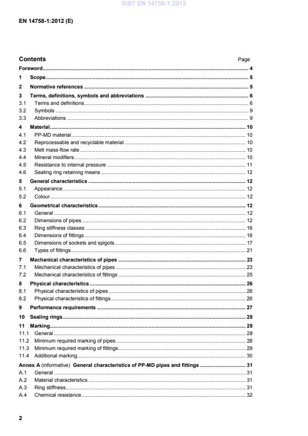 General characteristics of PP-MD pipes and fittings . 31 A.1 General . 31 A.2 Material characteristics . 31 A.3 Ring stiffness . 31 A.4 Chemical resistance . 32 SIST EN 14758-1:2012