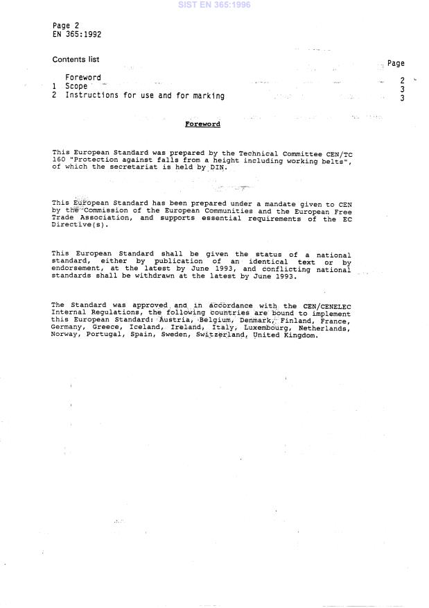 EN 365:1992 is a standard published by the European Committee for Standardization (CEN). Its full title is "Personal protective equipment against falls from a height - General requirements for instructions for use and for marking". This standard covers: This standard states the general requirements for instructions for use and marking of equipment for protection against falls from heights.