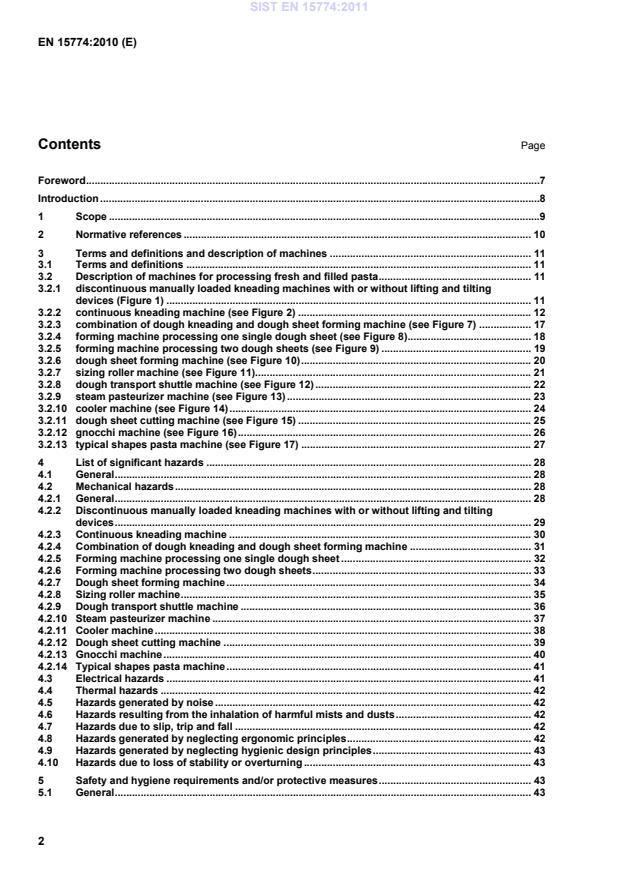 Relationship between this European Standard and the Essential Requirements of EU Directive 2006/42/EC . 72Bibliography . 73 Figures Figure 1a — Discontinuous manually loaded kneading machines without lifting and tilting system . 12Figure 1b — Discontinuous manually loaded kneading machines with lifting and tilting system . 12Figure 2 — Continuous kneading machine. 13Figure 3a — Kneading bowl singles shaft . 14Figure 3b — Kneading bowl double shaft . 14Figure 4 — Premixing device . 15Figure 5 — Dosing device for flour, semolina or other milled product . 16Figure 6a — Device for dough stabilization vertical . 17Figure 6b — Device for dough stabilization by belt . 17Figure 7 — Combination of dough kneading and dough sheet forming machine . 18Figure 8 — Forming machine processing one single dough sheet . 19Figure 9 — Forming machine processing two dough sheets . 20Figure 10 — Dough sheet forming machine . 21Figure 11 — Sizing roller machine . 22Figure 12 — Dough transport shuttle machine . 23Figure 13 — Steam pasteurizer machine . 24Figure 14 — Cooler machine . 25Figure 15 — Dough sheet cutting machine . 26Figure 16 — Gnocchi machine . 27Figure 17 — Typical shapes pasta machine . 28Figure 18 — Danger zones of discontinuous manually loaded kneading machine with or without lifting and tilting devices . 29Figure 19 — Danger zones of continuous kneading machine . 30Figure 20 — Danger zones of combination of dough kneading and dough sheet forming machine. 31Figure 21 — Danger zones of forming machine processing one single dough sheet . 32Figure 22 — Danger zones of forming machine processing two dough sheets . 33SIST EN 15774:2011