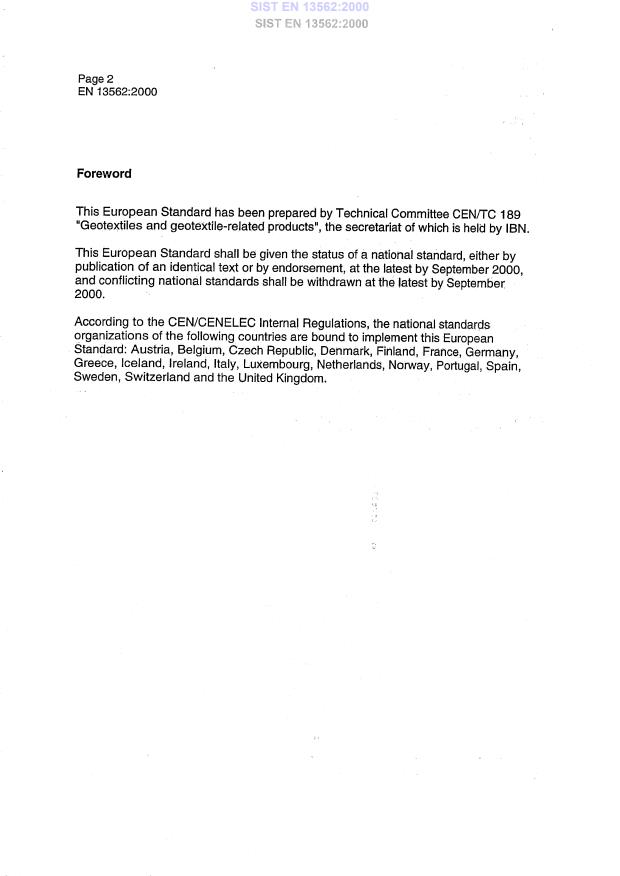 EN 13562:2000 is a standard published by the European Committee for Standardization (CEN). Its full title is "Geotextiles and geotextile-related products - Determination of resistance to penetration by water (hydrostatic pressure test)". This standard covers: Determination of the initial resistance of a dry geotextile or a dry geotextile-related product against water flow normally to the plane of the specimen. This resistance is defined by the water head required for the beginning of the flow. For open products such as geogrid and geonets, the test is not automatically applicable.