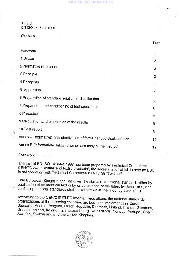 EN ISO 14184-1:1998 is a standard published by the European Committee for Standardization (CEN). Its full title is "Textiles - Determination of formaldehyde - Part 1: Free and hydrolyzed formaldehyde (water extraction method) (ISO 14184-1:1998)". This standard covers: This Part of ISO 14184 specifies a method for determining the amount of free formaldehyde extracted partly through hydrolysis by means of a water extraction method. The method can be applied to the testing of textile samples in any form. The procedure is intended for use in the range of free and hydrolysed formaldehyde on the fabric between 20 mg/kg and 3500 mg/kg when determined by this method. The lower limit is 20 mg/kg. Below this limit the result is reported as 'not detectable'.