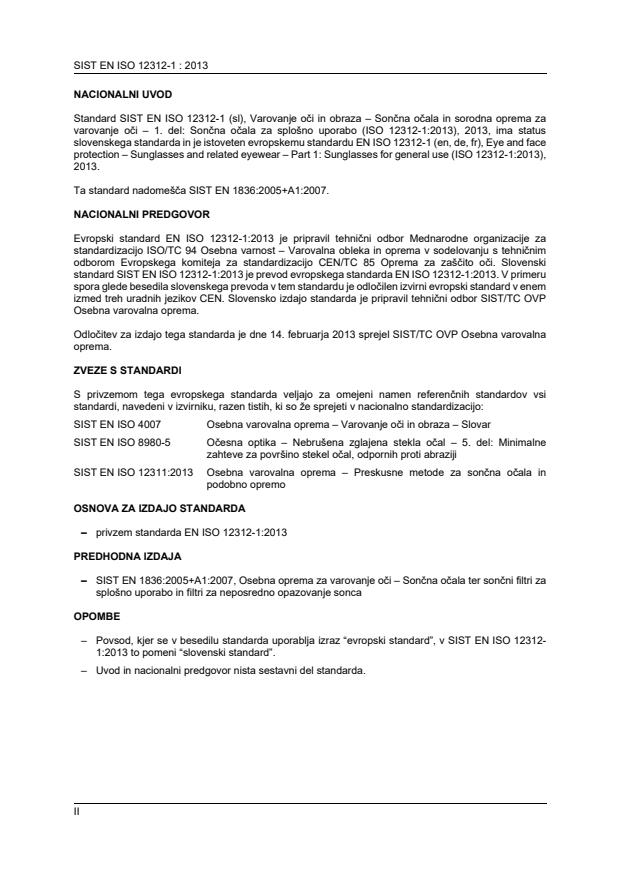 Ta del standarda ISO 12312 se uporablja za vsa afokalna (brez korekcije) sončna očala in nastavke za sončna očala za splošno uporabo, tudi za uporabo na cesti in vožnjo, ki so namenjeni zaščiti pred sončnim sevanjem. Informacije o uporabi filtrov sončnih očal so v dodatku A. Zahteve za nevgrajene filtre, ki se uporabljajo kot nadomestni ali alternativni filtri, so podane v dodatku B. Ta del standarda ISO 12312 se ne uporablja za: a) opremo za varovanje oči pred sevanjem umetnih svetlobnih virov, npr. v solariju; b) zaščito za oči pri specifičnih športih (npr. smučarska očala ali druge vrste); c) sončna očala, ki so bila zdravniško predpisana za slabitev sončnega sevanja); d) izdelke, namenjene neposrednemu opazovanju sonca, npr. za opazovanje delnega ali obročastega sončnega mrka.