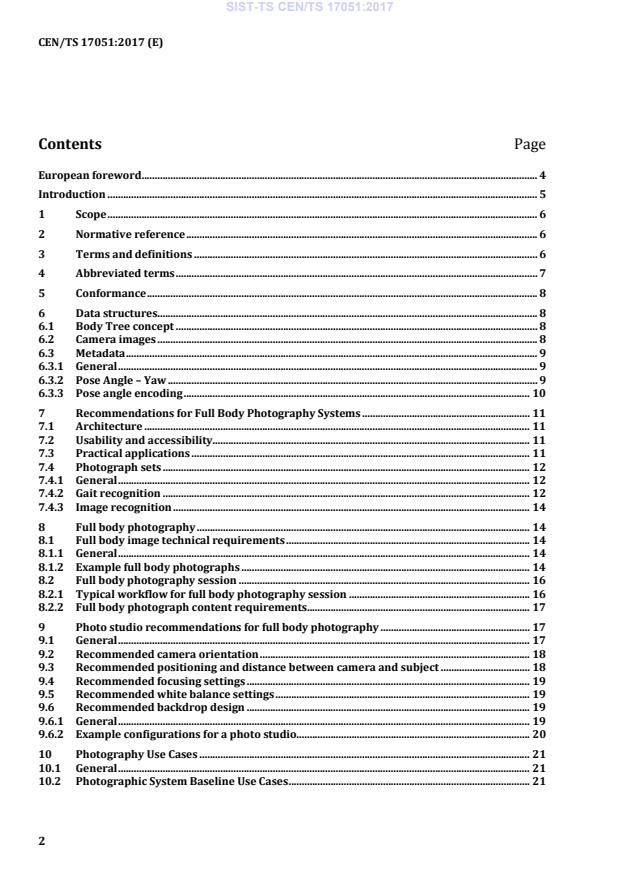 This Technical Specification is intended to provide a Full Body Image Format for pattern recognition services and applications requiring the exchange of full body image data. Its typical applications include: a) human examination of high resolution full body images; b) human verification of identity based on full body images; c) computer automated full body identification; d) computer automated full body verification. To enable applications on a wide variety of devices, including devices that have limited data storage, and to improve image recognition accuracy, ISO/IEC 19794 standards are followed regarding not only data format, but also scene constraints (lighting, pose, expression, etc.), photographic properties (positioning, camera focus, etc.), and digital image attributes (image resolution, image size, etc.). A specific biometric profile for cross-border interoperability is required for full body photographs. Full body photography standardization is required to get good quality database images for identification and verification using video surveillance and other similar system generated images. At the moment, border guards take full body photographs using local practices for enrolment, verification, identification and watch list identification. ISO 22311:2012 [10] specifies a common output file format that can be extracted from the video-surveillance contents collection systems to perform necessary processing. ISO/IEC 30137 [8] specifies data formats for storing, recording and transmitting biometric information acquired via a video surveillance system. The EN 62676 series [11] defines video surveillance systems for use in security applications. The purpose of this Technical Specification is to provide expert guidance (i.e. best practices) for the photography of full body, especially when the resulting images are to be used for purposes of identification and verification, either by automated recognition systems or by human viewers.