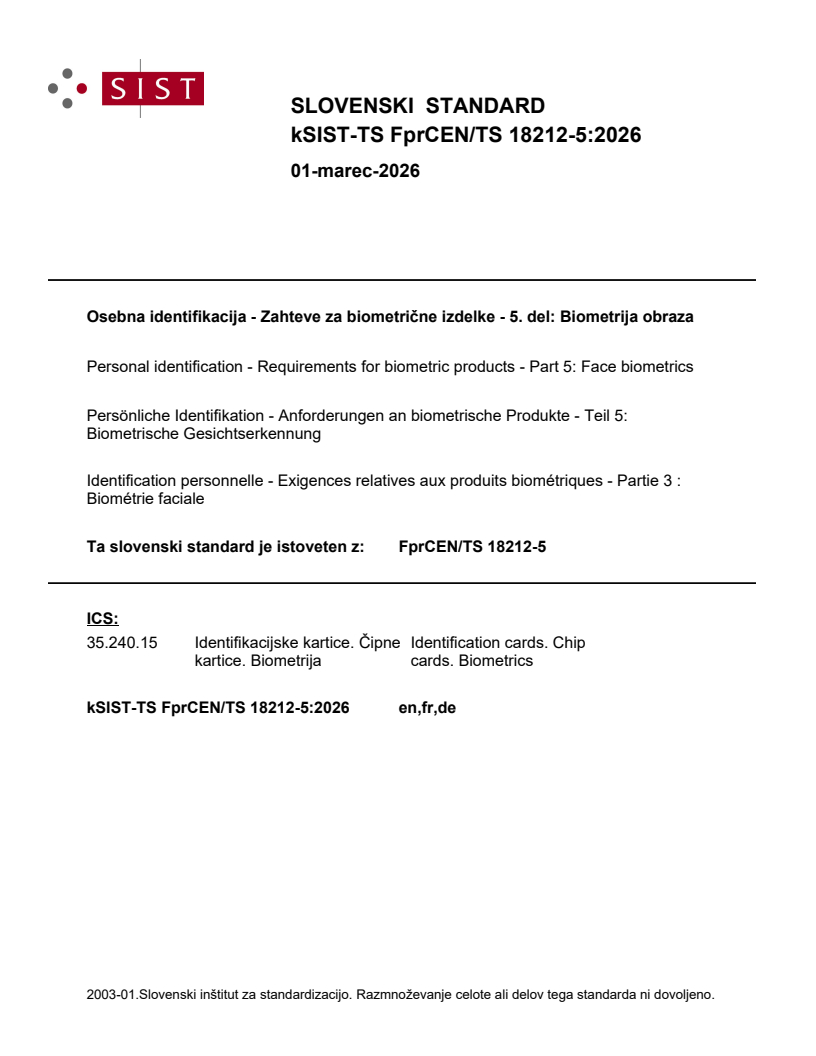 Osebna identifikacija - Zahteve za biometrične izdelke - 5. del: Biometrija obraza
